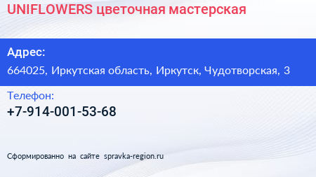 UNIFLOWERS, цветочная мастерская по адресу 664025, Иркутская область, Иркутск, Чудотворская, 3 в дальнейшем Организация, размещена в следующих категориях:
