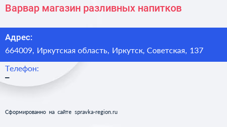 Варвар, магазин разливных напитков по адресу 664009, Иркутская область, Иркутск, Советская, 137 в дальнейшем Организация, размещена в следующих категориях: