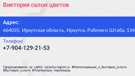 Виктория, салон цветов по адресу 664035, Иркутская область, Иркутск, Рабочего Штаба, 134 в дальнейшем Организация, размещена в следующих категориях: