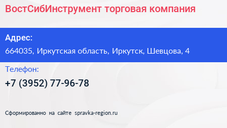 ВостСибИнструмент, торговая компания по адресу 664035, Иркутская область, Иркутск, Шевцова, 4 в дальнейшем Организация, размещена в следующих категориях: