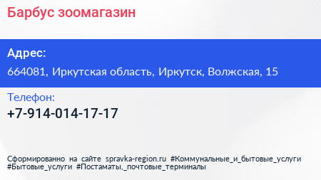 Барбус, зоомагазин по адресу 664081, Иркутская область, Иркутск, Волжская, 15 в дальнейшем Организация, размещена в следующих категориях: