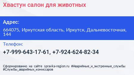 Хвастун, салон для животных по адресу 664075, Иркутская область, Иркутск, Дальневосточная, 144 в дальнейшем Организация, размещена в следующих категориях:
