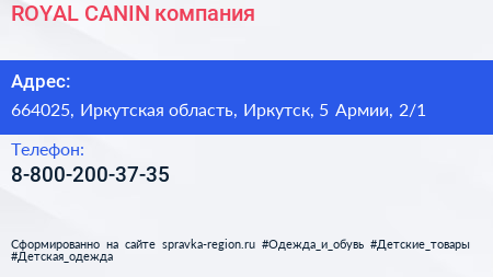ROYAL CANIN, компания по адресу 664025, Иркутская область, Иркутск, 5 Армии, 2/1 в дальнейшем Организация, размещена в следующих категориях: