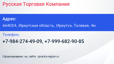 Русская Торговая Компания по адресу 664014, Иркутская область, Иркутск, Толевая, 4и в дальнейшем Организация, размещена в следующих категориях: