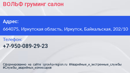 ВОЛЬФ, груминг-салон по адресу 664075, Иркутская область, Иркутск, Байкальская, 202/10 в дальнейшем Организация, размещена в следующих категориях: