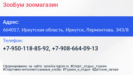 ЗооБум, зоомагазин по адресу 664017, Иркутская область, Иркутск, Лермонтова, 343/8 в дальнейшем Организация, размещена в следующих категориях: