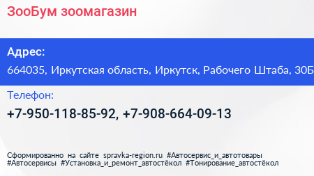 ЗооБум, зоомагазин по адресу 664035, Иркутская область, Иркутск, Рабочего Штаба, 30Б в дальнейшем Организация, размещена в следующих категориях: