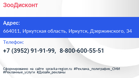 ЗооДисконт по адресу 664011, Иркутская область, Иркутск, Дзержинского, 34 в дальнейшем Организация, размещена в следующих категориях: