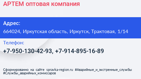 АРТЕМ, оптовая компания по адресу 664024, Иркутская область, Иркутск, Трактовая, 1/14 в дальнейшем Организация, размещена в следующих категориях: