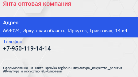 Янта, оптовая компания по адресу 664024, Иркутская область, Иркутск, Трактовая, 14 к4 в дальнейшем Организация, размещена в следующих категориях: