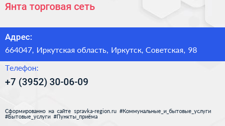Янта, торговая сеть по адресу 664047, Иркутская область, Иркутск, Советская, 98 в дальнейшем Организация, размещена в следующих категориях: