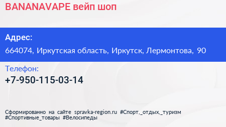 BANANAVAPE, вейп-шоп по адресу 664074, Иркутская область, Иркутск, Лермонтова, 90 в дальнейшем Организация, размещена в следующих категориях: