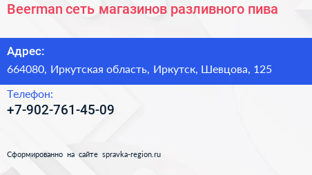 Beerman, сеть магазинов разливного пива по адресу 664080, Иркутская область, Иркутск, Шевцова, 125 в дальнейшем Организация, размещена в следующих категориях: