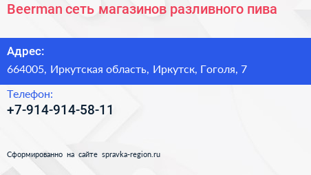 Beerman, сеть магазинов разливного пива по адресу 664005, Иркутская область, Иркутск, Гоголя, 7 в дальнейшем Организация, размещена в следующих категориях: