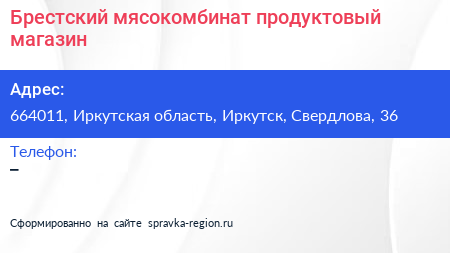 Брестский мясокомбинат, продуктовый магазин по адресу 664011, Иркутская область, Иркутск, Свердлова, 36 в дальнейшем Организация, размещена в следующих категориях: