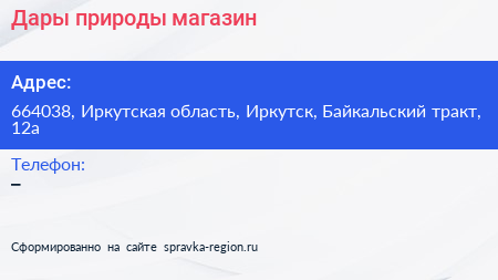 Дары природы, магазин по адресу 664038, Иркутская область, Иркутск, Байкальский тракт, 12а в дальнейшем Организация, размещена в следующих категориях: