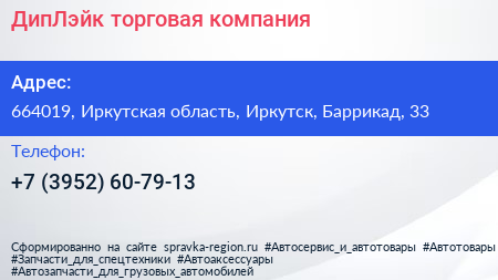 ДипЛэйк, торговая компания по адресу 664019, Иркутская область, Иркутск, Баррикад, 33 в дальнейшем Организация, размещена в следующих категориях: