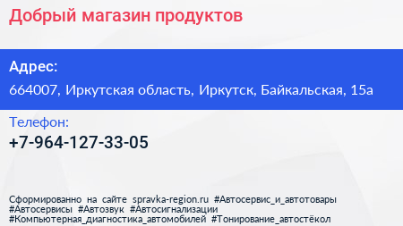 Добрый, магазин продуктов по адресу 664007, Иркутская область, Иркутск, Байкальская, 15а в дальнейшем Организация, размещена в следующих категориях: