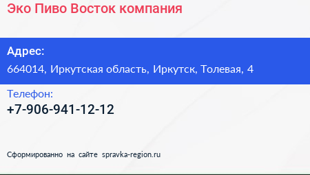 Эко Пиво Восток, компания по адресу 664014, Иркутская область, Иркутск, Толевая, 4 в дальнейшем Организация, размещена в следующих категориях: