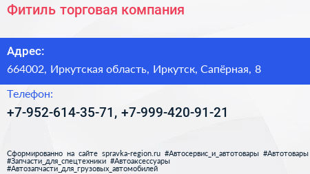 Фитиль, торговая компания по адресу 664002, Иркутская область, Иркутск, Сапёрная, 8 в дальнейшем Организация, размещена в следующих категориях: