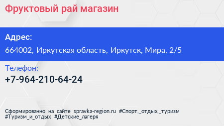 Фруктовый рай, магазин по адресу 664002, Иркутская область, Иркутск, Мира, 2/5 в дальнейшем Организация, размещена в следующих категориях: