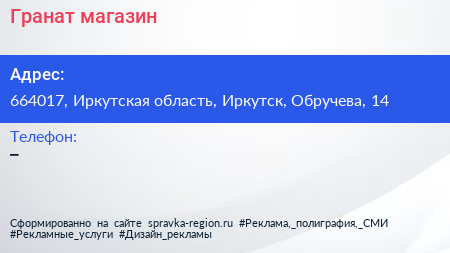Гранат, магазин по адресу 664017, Иркутская область, Иркутск, Обручева, 14 в дальнейшем Организация, размещена в следующих категориях: