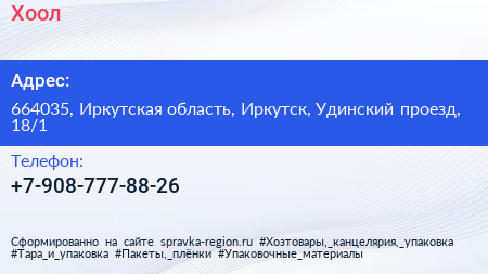 Хоол по адресу 664035, Иркутская область, Иркутск, Удинский проезд, 18/1 в дальнейшем Организация, размещена в следующих категориях: