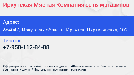 Иркутская Мясная Компания, сеть магазинов по адресу 664047, Иркутская область, Иркутск, Партизанская, 102 в дальнейшем Организация, размещена в следующих категориях: