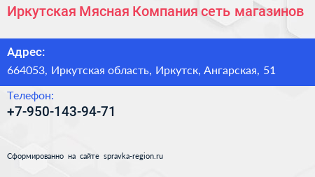 Иркутская Мясная Компания, сеть магазинов по адресу 664053, Иркутская область, Иркутск, Ангарская, 51 в дальнейшем Организация, размещена в следующих категориях: