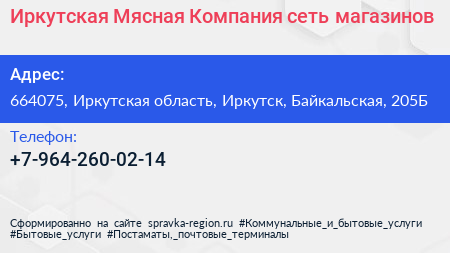 Иркутская Мясная Компания, сеть магазинов по адресу 664075, Иркутская область, Иркутск, Байкальская, 205Б в дальнейшем Организация, размещена в следующих категориях:
