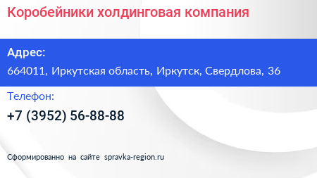 Коробейники, холдинговая компания по адресу 664011, Иркутская область, Иркутск, Свердлова, 36 в дальнейшем Организация, размещена в следующих категориях: