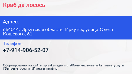 Краб да лосось по адресу 664014, Иркутская область, Иркутск, улица Олега Кошевого, 61 в дальнейшем Организация, размещена в следующих категориях: