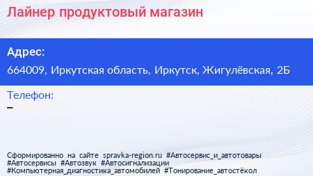 Лайнер, продуктовый магазин по адресу 664009, Иркутская область, Иркутск, Жигулёвская, 2Б в дальнейшем Организация, размещена в следующих категориях: