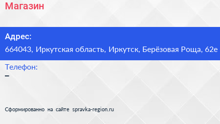 Магазин по адресу 664043, Иркутская область, Иркутск, Берёзовая Роща, 62е в дальнейшем Организация, размещена в следующих категориях: