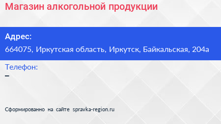 Магазин алкогольной продукции по адресу 664075, Иркутская область, Иркутск, Байкальская, 204а в дальнейшем Организация, размещена в следующих категориях:
