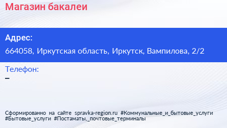 Магазин бакалеи по адресу 664058, Иркутская область, Иркутск, Вампилова, 2/2 в дальнейшем Организация, размещена в следующих категориях: