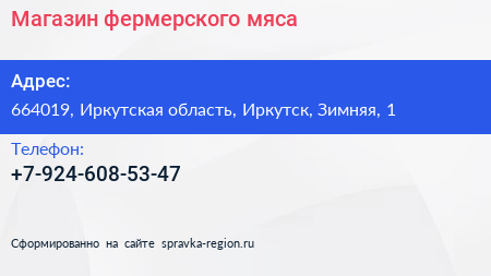 Магазин фермерского мяса по адресу 664019, Иркутская область, Иркутск, Зимняя, 1 в дальнейшем Организация, размещена в следующих категориях: