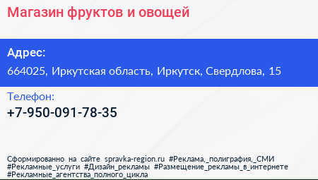 Магазин фруктов и овощей по адресу 664025, Иркутская область, Иркутск, Свердлова, 15 в дальнейшем Организация, размещена в следующих категориях: