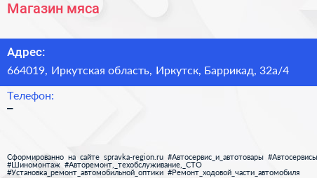 Магазин мяса по адресу 664019, Иркутская область, Иркутск, Баррикад, 32а/4 в дальнейшем Организация, размещена в следующих категориях: