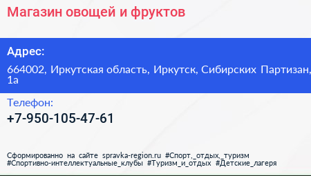 Магазин овощей и фруктов по адресу 664002, Иркутская область, Иркутск, Сибирских Партизан, 1а в дальнейшем Организация, размещена в следующих категориях: