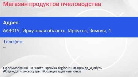 Магазин продуктов пчеловодства по адресу 664019, Иркутская область, Иркутск, Зимняя, 1 в дальнейшем Организация, размещена в следующих категориях: