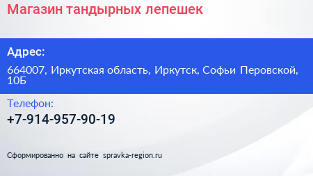 Магазин тандырных лепешек по адресу 664007, Иркутская область, Иркутск, Софьи Перовской, 10Б в дальнейшем Организация, размещена в следующих категориях: