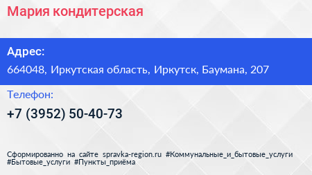 Мария, кондитерская по адресу 664048, Иркутская область, Иркутск, Баумана, 207 в дальнейшем Организация, размещена в следующих категориях: