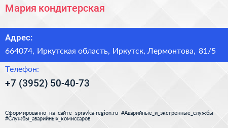Мария, кондитерская по адресу 664074, Иркутская область, Иркутск, Лермонтова, 81/5 в дальнейшем Организация, размещена в следующих категориях: