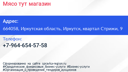 Мясо тут, магазин по адресу 664058, Иркутская область, Иркутск, квартал Стрижи, 9 в дальнейшем Организация, размещена в следующих категориях: