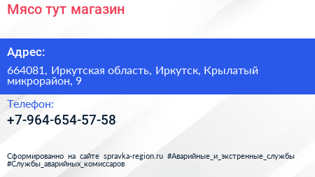 Мясо тут, магазин по адресу 664081, Иркутская область, Иркутск, Крылатый микрорайон, 9 в дальнейшем Организация, размещена в следующих категориях:
