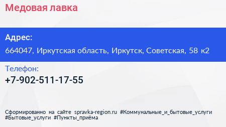 Медовая лавка по адресу 664047, Иркутская область, Иркутск, Советская, 58 к2 в дальнейшем Организация, размещена в следующих категориях: