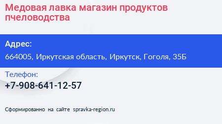 Медовая лавка, магазин продуктов пчеловодства по адресу 664005, Иркутская область, Иркутск, Гоголя, 35Б в дальнейшем Организация, размещена в следующих категориях: