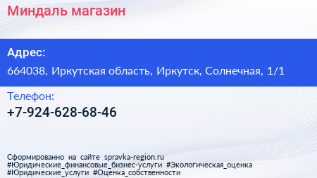 Миндаль, магазин по адресу 664038, Иркутская область, Иркутск, Солнечная, 1/1 в дальнейшем Организация, размещена в следующих категориях: