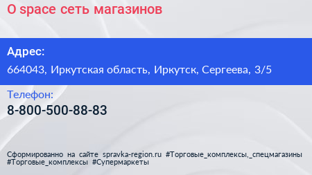 O: spaсe, сеть магазинов по адресу 664043, Иркутская область, Иркутск, Сергеева, 3/5 в дальнейшем Организация, размещена в следующих категориях: